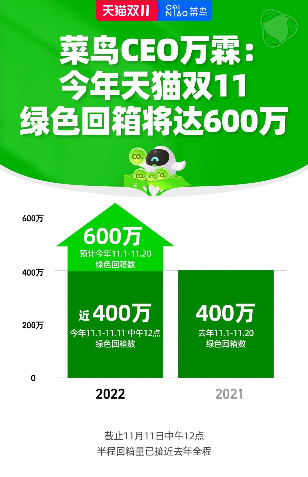 天猫双 11 绿色参与量再创新高。今天(11 月 11 日)下午,菜鸟 CEO 万霖表示,今年双 11 物流运行到半程时的回箱量就已接近去年全程,整个双 11 物流全周期的绿色回箱数将达到 600 万个,相较去年增长 50%。